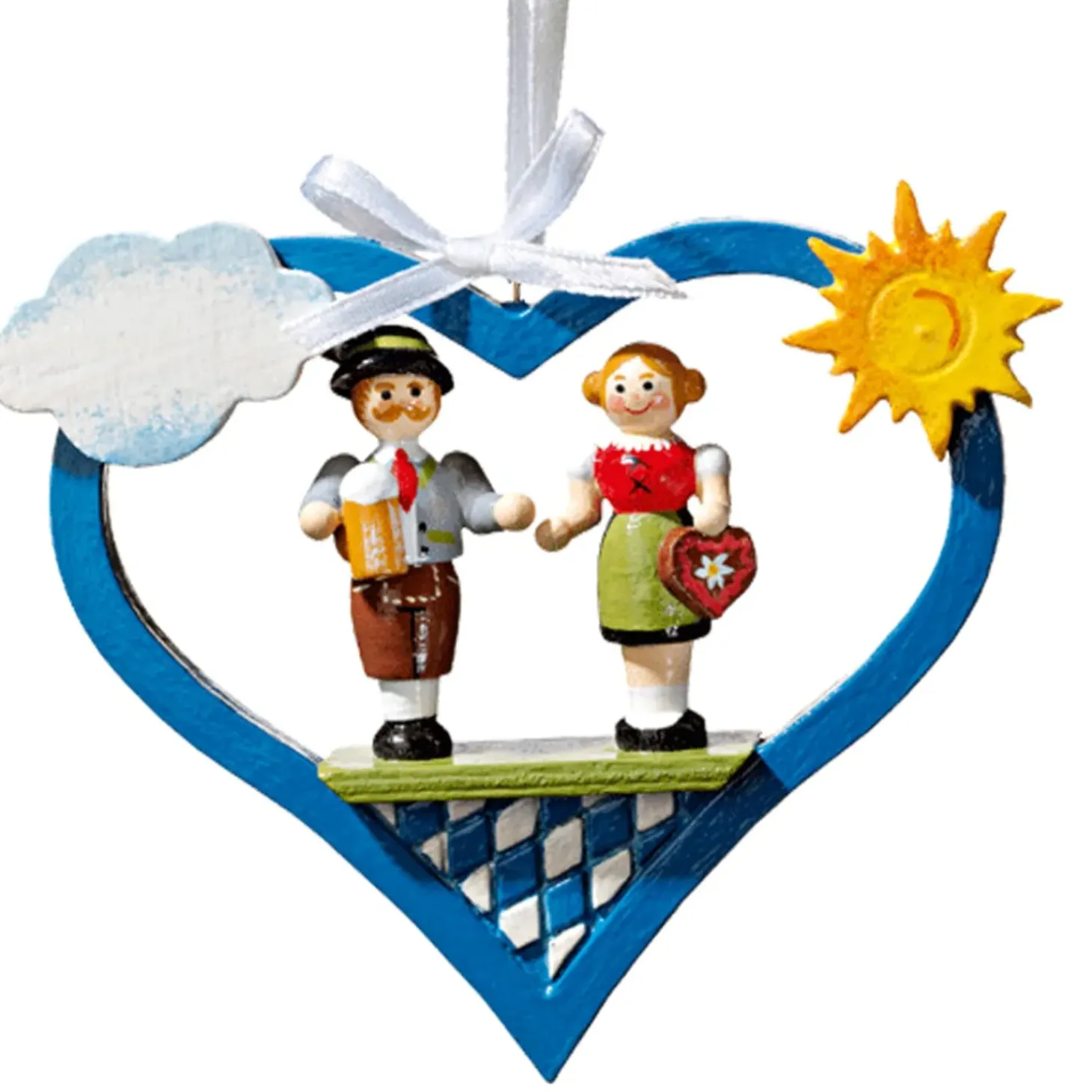 Der Himmel Leuchtet In Den Bayerischen Farben Weis Und Blau Und Die Sonne Lacht Am Himmel. In Bayern Wird Tradition Und Brauchtum Noch Grosgeschrieben. Das Spiegelt Sich Auch In Der Traditionellen Kleidung Wider, Die Zu Besonderen Anlassen Und Festen Getragen Wird. Das Hubsche Trachtenpaar Tragt Hier Naturlich Dirndl Und Lederhosen. Der Mann Halt Noch Eine Mas Bier Und Die Frau Ein Lebkuchenherz In Der Hand. Das Blaue Herz Ist Eine Schone Erinnerung An Eine Reise Nach Bayern Und Ein Nettes Mitbringsel Von Dieser Reise, Aber Naturlich Auch Ein Tolles Dekorationselement Fur Alle Bayern-Fans!