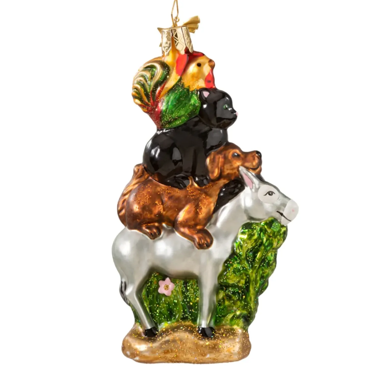 Dort Stehen Sie Alle Vier Vereint Auf Einem Waldweg Neben Hohen Gras Und Bilden Einen Turm: Die Bremer Stadtmusikanten. Ganz Unten Ist Der Graue Esel, Der Seine Drei Freunde Auf Dem Rucken Balanciert. Uber Ihm Der Braune Jagdhund, Der Die Schwarze Katze Stemmt. Ganz Oben Thront Der Bunte Hahn, Der Die Spitze Des Quartetts Bildet. Wann Sie Wohl Bremen Erreichen Werden?