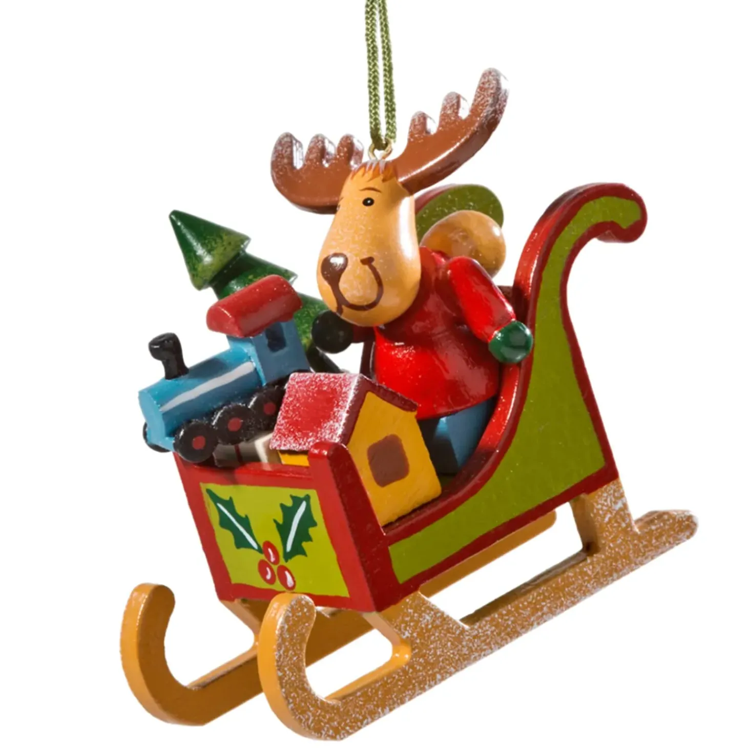 Ob Er Auch Ihr Geschenk Dabei Hat? Der Grune Schlitten Ist Mit Einem Puppenhaus, Einer Spielzeuglokomotive Und Einem Tannenbaum Beladen Und An Den Kufen Haftet Der Schnee. Der Elch Im Roten Pullover Steuert Sein Gefahrt Sicher Durch Die Winterliche Landschaft. Was Er Wohl In Seinem Braunen Geschenkesack Versteckt?