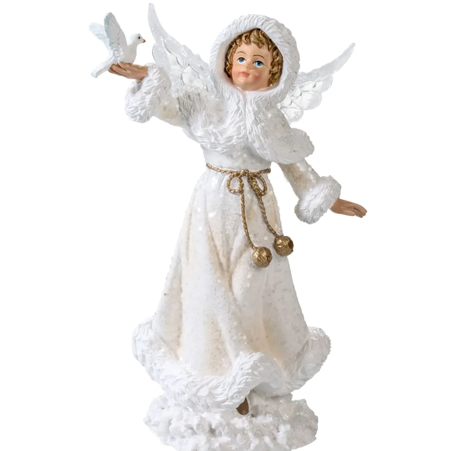 Der Schone Himmelsbote Bringt Friede Und Freude Zum Weihnachtsfest. Ganz In Weis Halt Der Engel Voller Bewunderung Die Taube Auf Seiner Hand.
