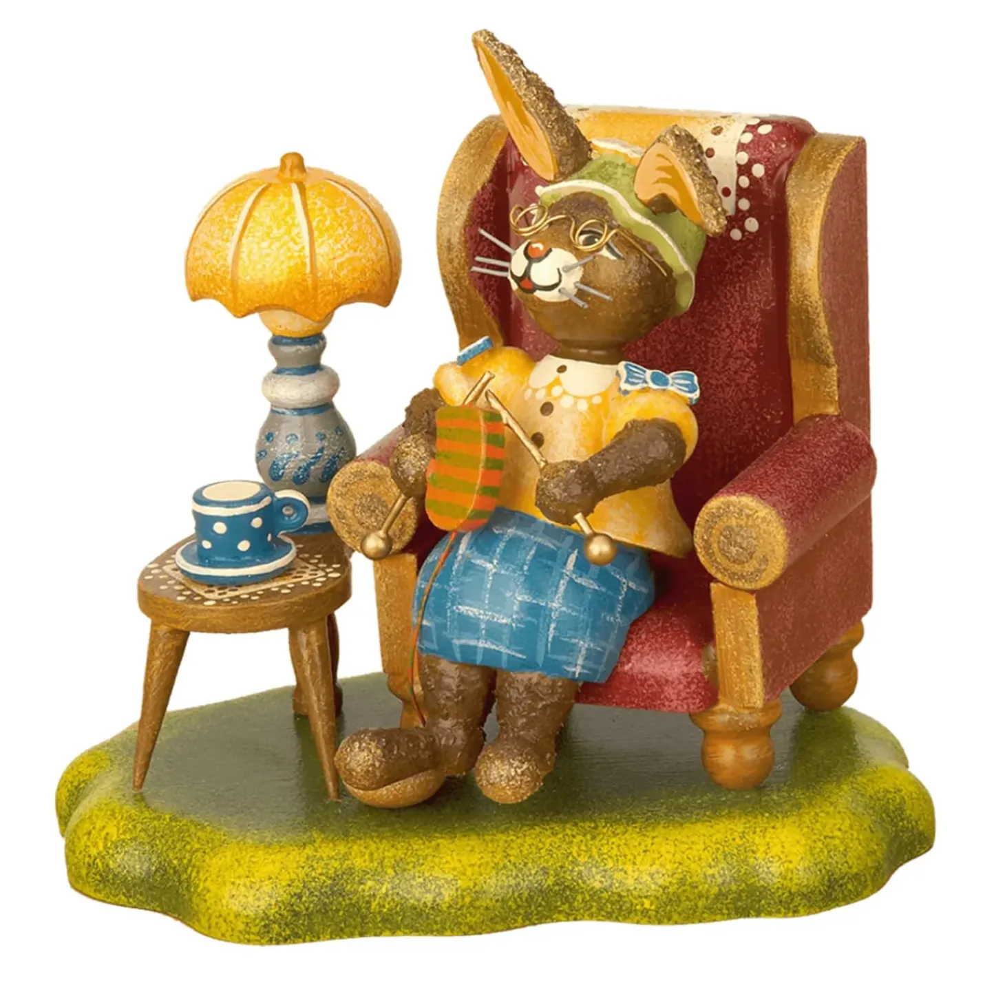 Die Hasenoma Macht Es Sich In Ihrem Roten Sessel Gemutlich. Sie Geniest Im Lampenschein Eine Gute Tasse Tee Und Vertreibt Sich Die Zeit Mit Stricken.