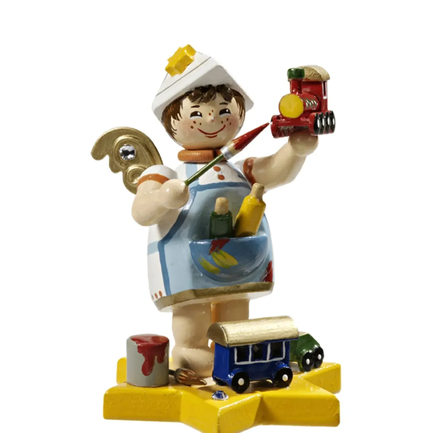 Mit Viel Liebe Zum Detail Bemalt Dieser Entzuckende Jahresengel Eine Spielzeugeisenbahn In Den Schonsten Farben! Eben Wird Die Lok In Seinen Handen Mit Einem Schonen Rot Bemalt. Der Dazugehorige Farbtopf Steht Zu Seinen Fusen Auf Dem Himmelsstern. In Seinem Malerkittel Hat Er Aber Noch Weitere Tuben Mit Farbe Fur Die Dazugehorigen Wagons.