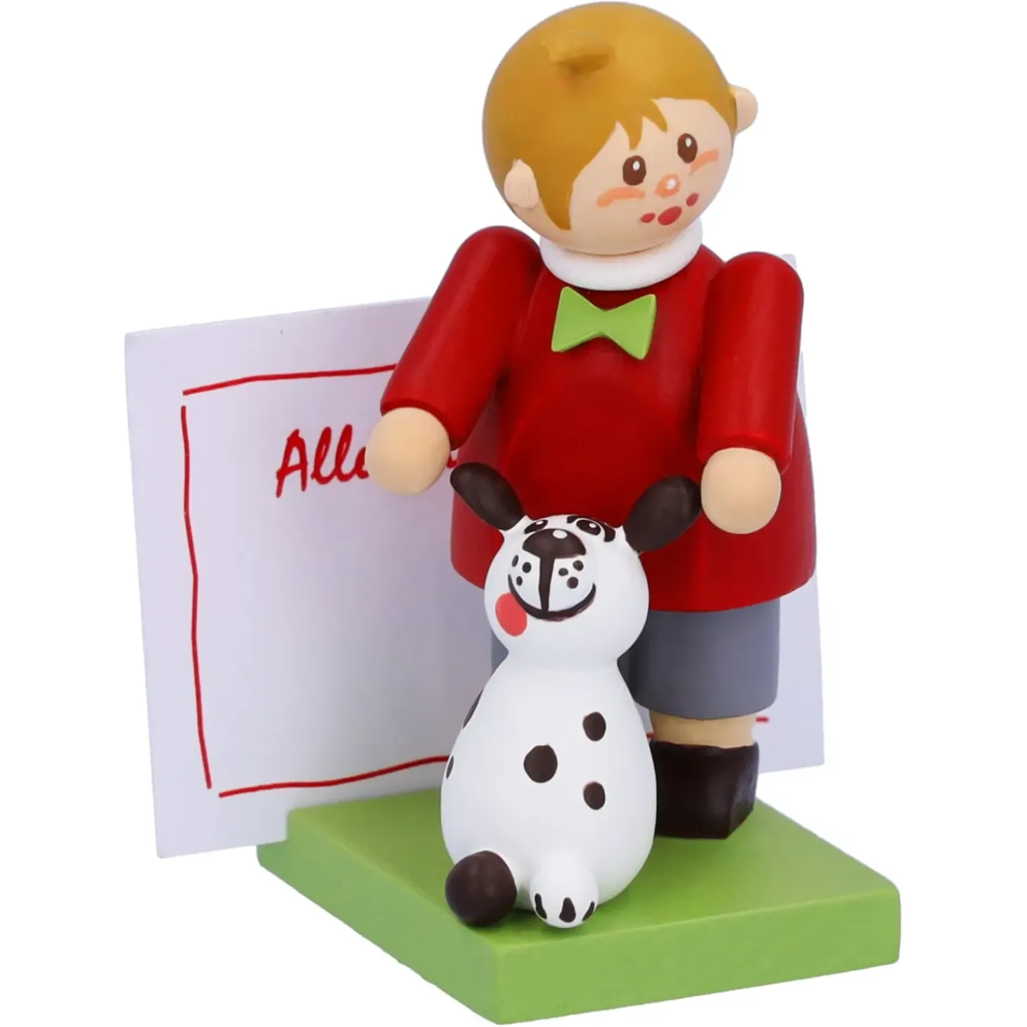 Liebevoll Krault Der Niedliche Junge Seinen Treuen Freund Bello. Das Niedliche Weis Schwarze Hundchen Geniest Die Streicheleinheiten Und Freut Sich Schon Auf Toben Und Spielen Mit Dem Kleinen Jungen. Auf Dem Sockel Konnen Sie Ihre Personliche Botschaft Fur Einen Guten Freund Platzieren. Die Passenden Zettel Bringt Das Duo Gleich Mit.