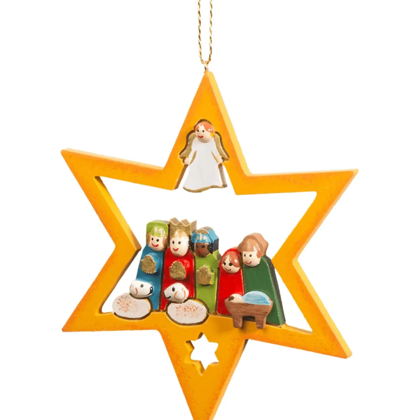 Konnen Sie Das Wiegenlied Schon Horen? Die Farbenfrohe Kleine Krippendarstellung Ist In Einen Gelben Stern Eingebettet Und Wird Ihre Weihnachtsdekoration Bereichern! In Der Sternenspitze Schwebt Der Verkundungsengel Uber Der Heiligen Familie Und Den Heiligen Drei Konigen.
