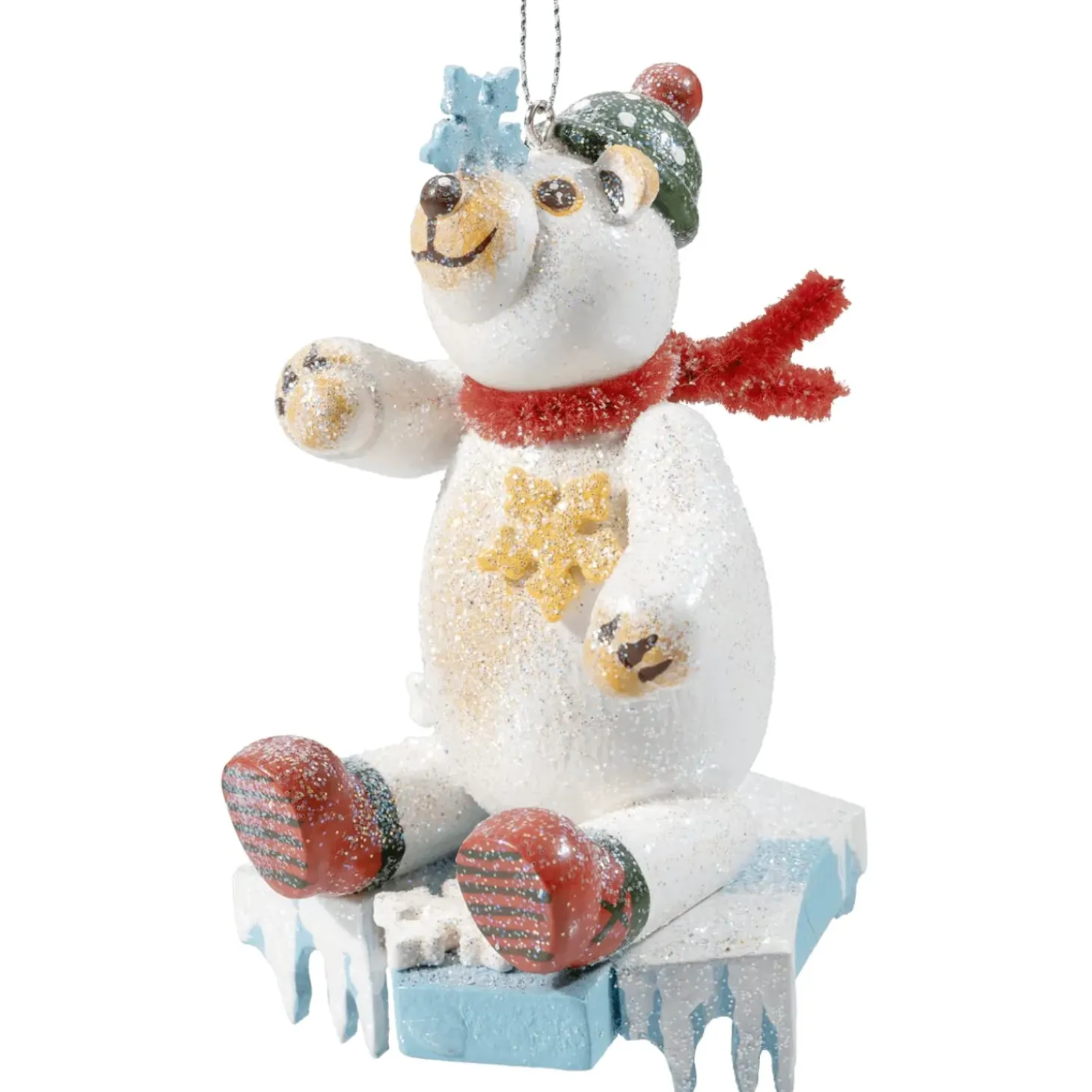 Der Knuddelige Eisbar Sitzt Auf Einer Eisscholle Und Spielt Vergnugt Mit Einer Schneeflocke, Welche Ihm Nun Auf Der Schnauze Gelandet Ist. Der Niedliche Eisbar Tragt Eine Grune Bommelmutze, Einen Flauschigen Roten Schal, Rote Schuhe Und Ist Mit Einem Feinem Und Glanzenden Glitzerstaub Umhullt. Der Frostige Charakter Des Eisbaren Kommt So Besonders Gut Zur Geltung.