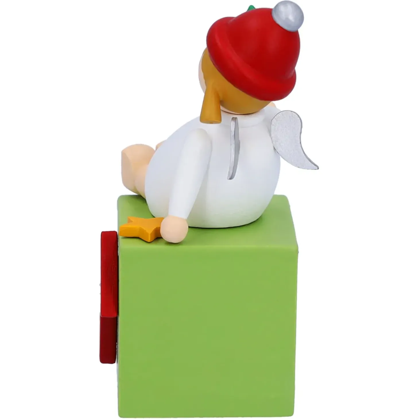 Das Geschenk Des Engelchens Ist So Gros, Dass Es Sogar Drauf Sitzen Kann. Auf Dem Kopf Tragt Der Kleine Engel Eine Rote Bommelmutze. In Der Hand Halt Es Einen Kleinen Weihnachtsbaum.
