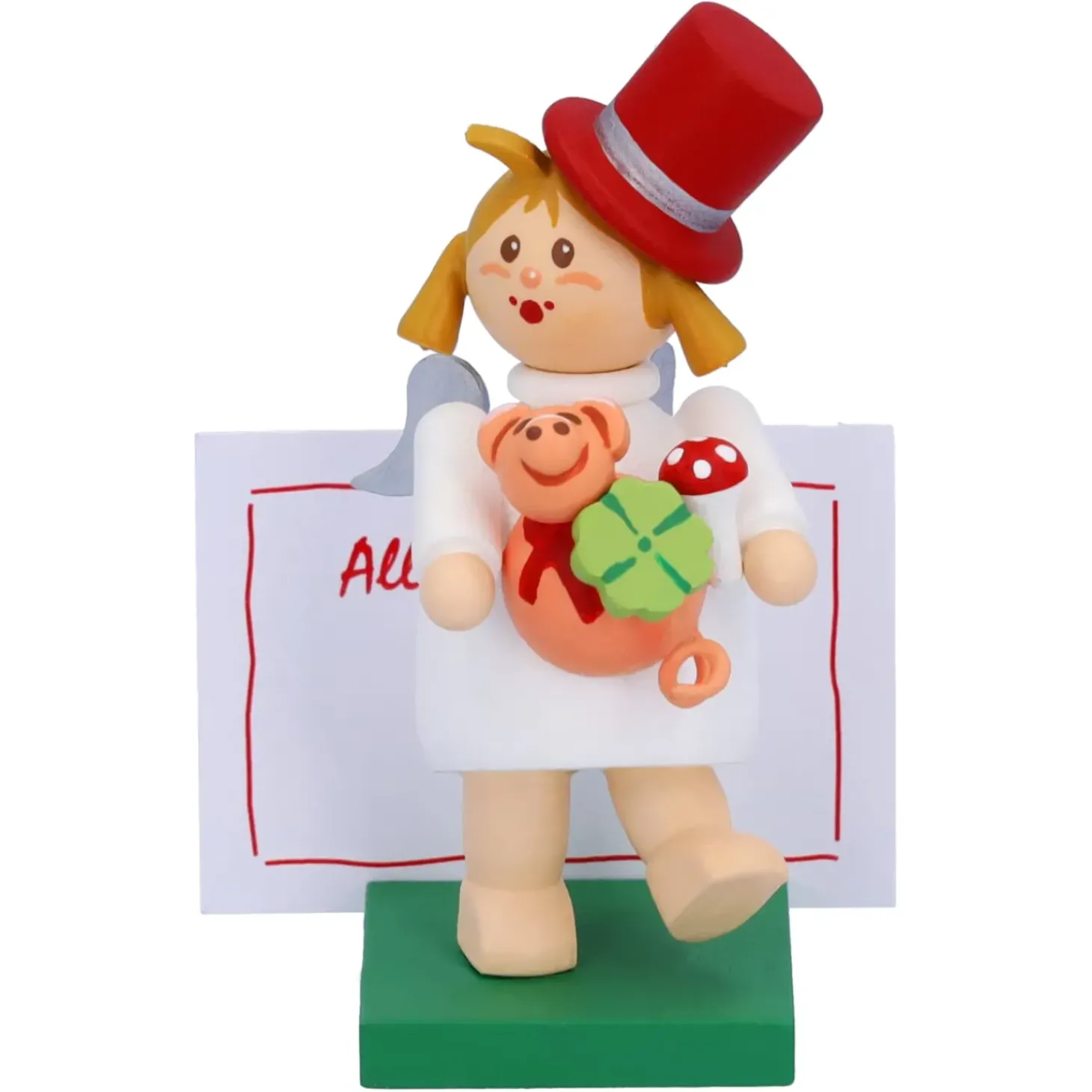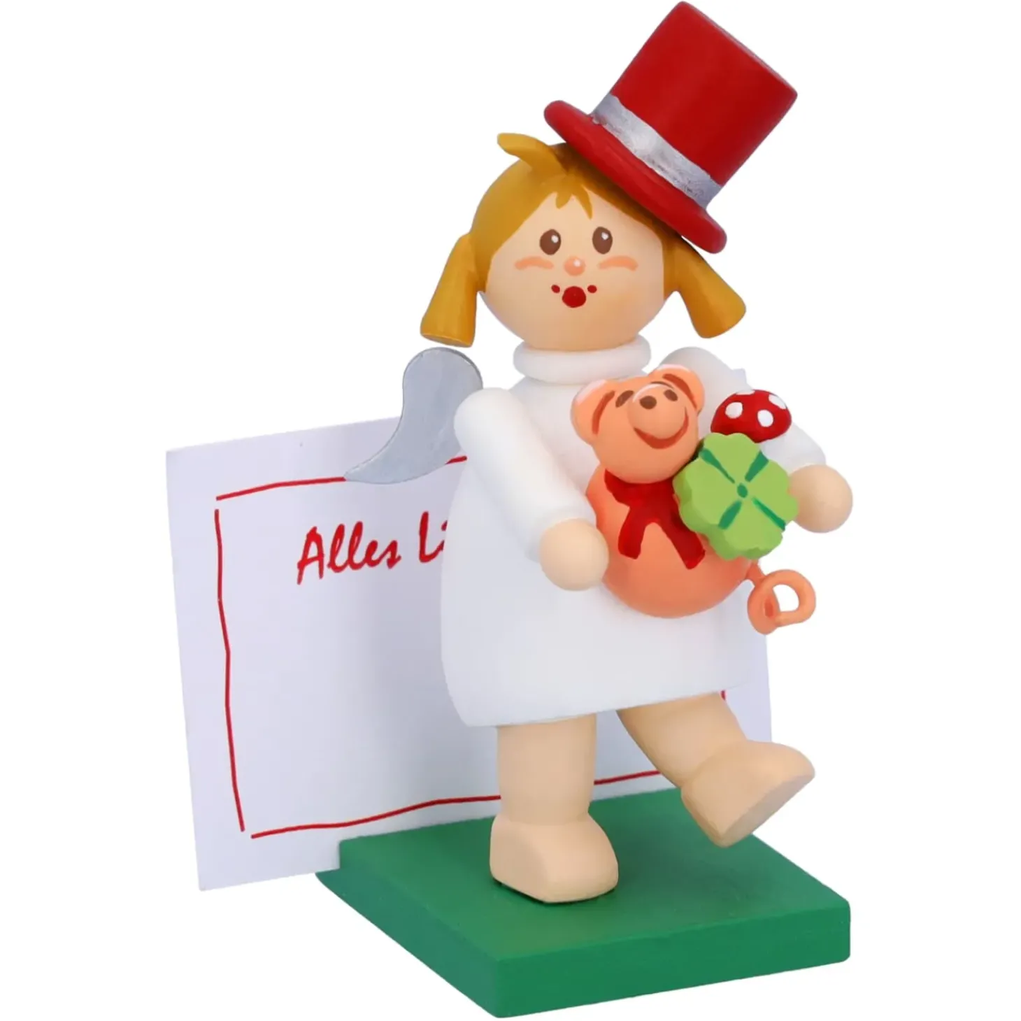 Mit Diesem Kleinen Glucksbringer Kann Nichts Mehr Schief Gehen. Das Kleine Engelchen Hat Zur Unterstutzung Ein Rosa Glucksschweinchen Und Einen Glucksklee Dabei. Der Schornsteinfeger Hat Dem Engelchen, Fur Die Extraportion Gluck, Seinen Zylinder Geliehen. Voller Stolz Tragt Der Kleine Glucksbringer Den Hut Auf Seinem Kopf.