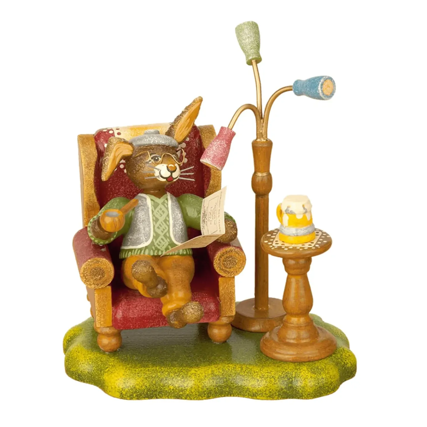 Der Hasenopa Macht Es Sich In Seinem Roten Sessel Gemutlich. Er Geniest Im Lampenschein Seinen Feierabend Bei Bier, Pfeife Und Zeitung.