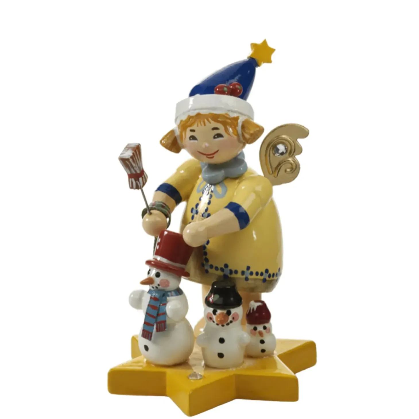 Wie Die Orgelpfeifen Stehen Die Hubschen Schneemanner Auf Dem Himmelsstern. Das Niedliche Engelmadchen Mit Einer Blauen Weihnachtsmutze Hat Sichtlich Freude Am Schneemannbauen. Knopfe Aus Schwarzen Steinen, Nasen Aus Karotten, Hute Oder Mutzen Und Schals Durfen Bei Keinem Schneemann Fehlen. Fehlt Nur Noch Der Typische Reisigbesen Fur Den Grosten Schneemann. Das Engelchen Bringt Auch Zu In Ihr Zuhause Eine Frohliche Winterstimmung!
