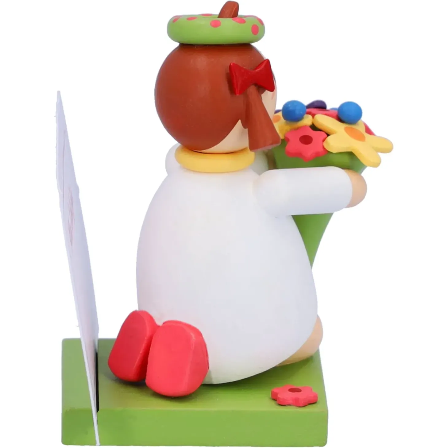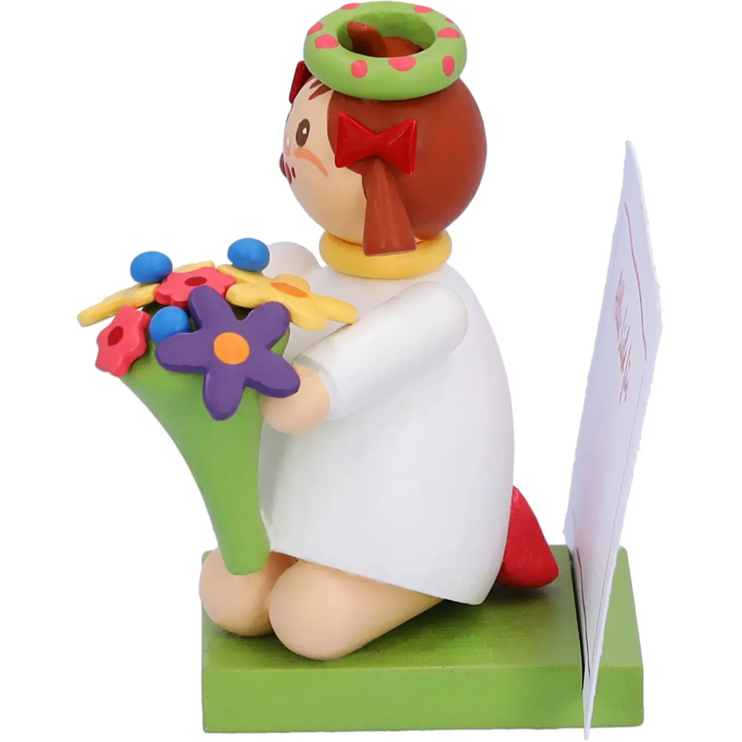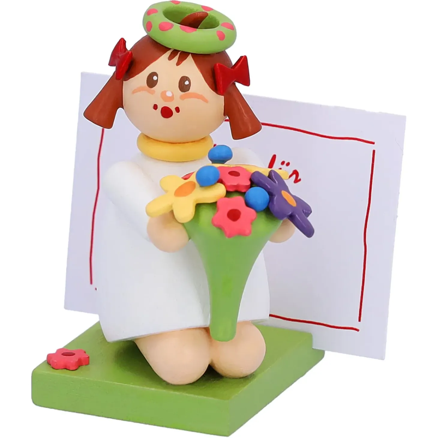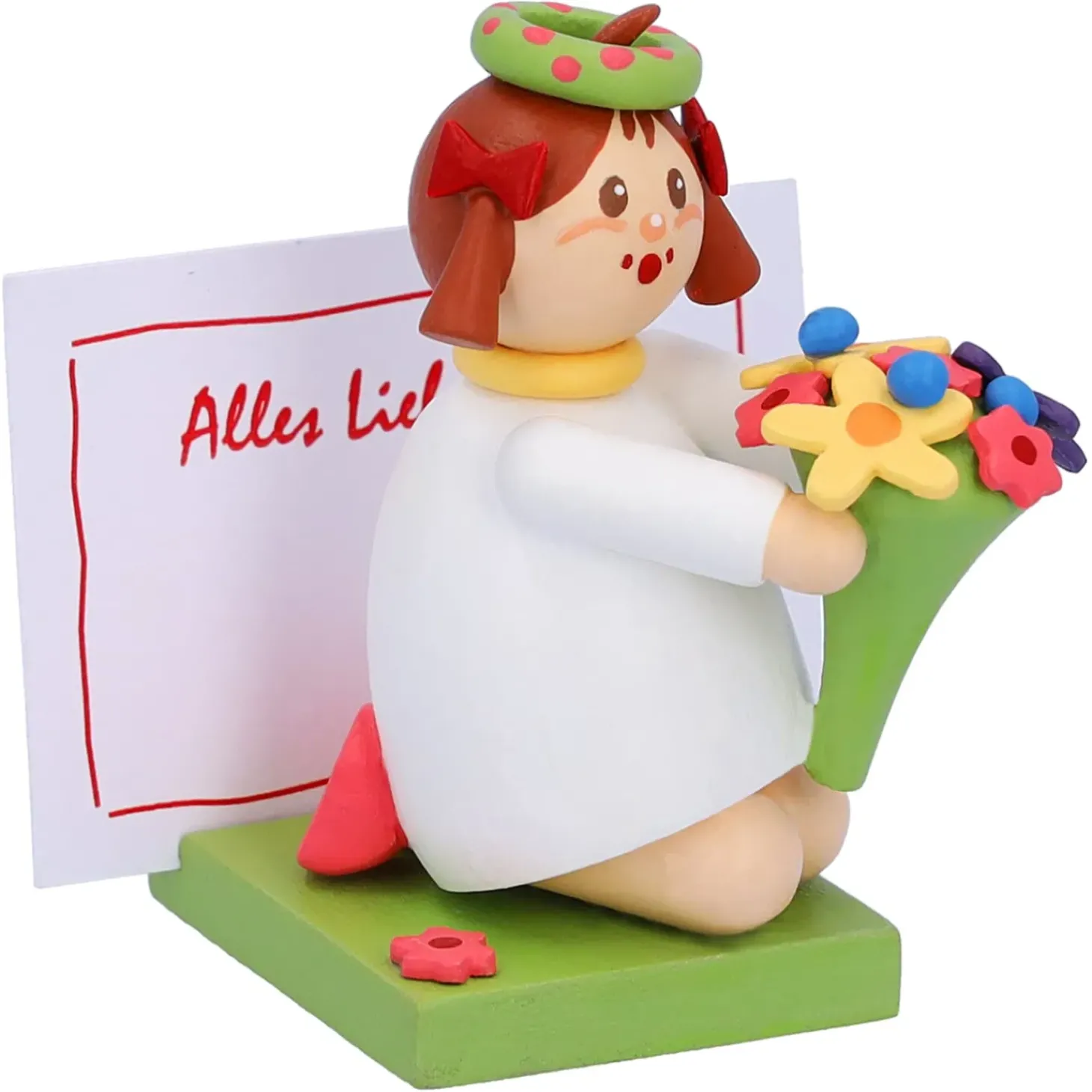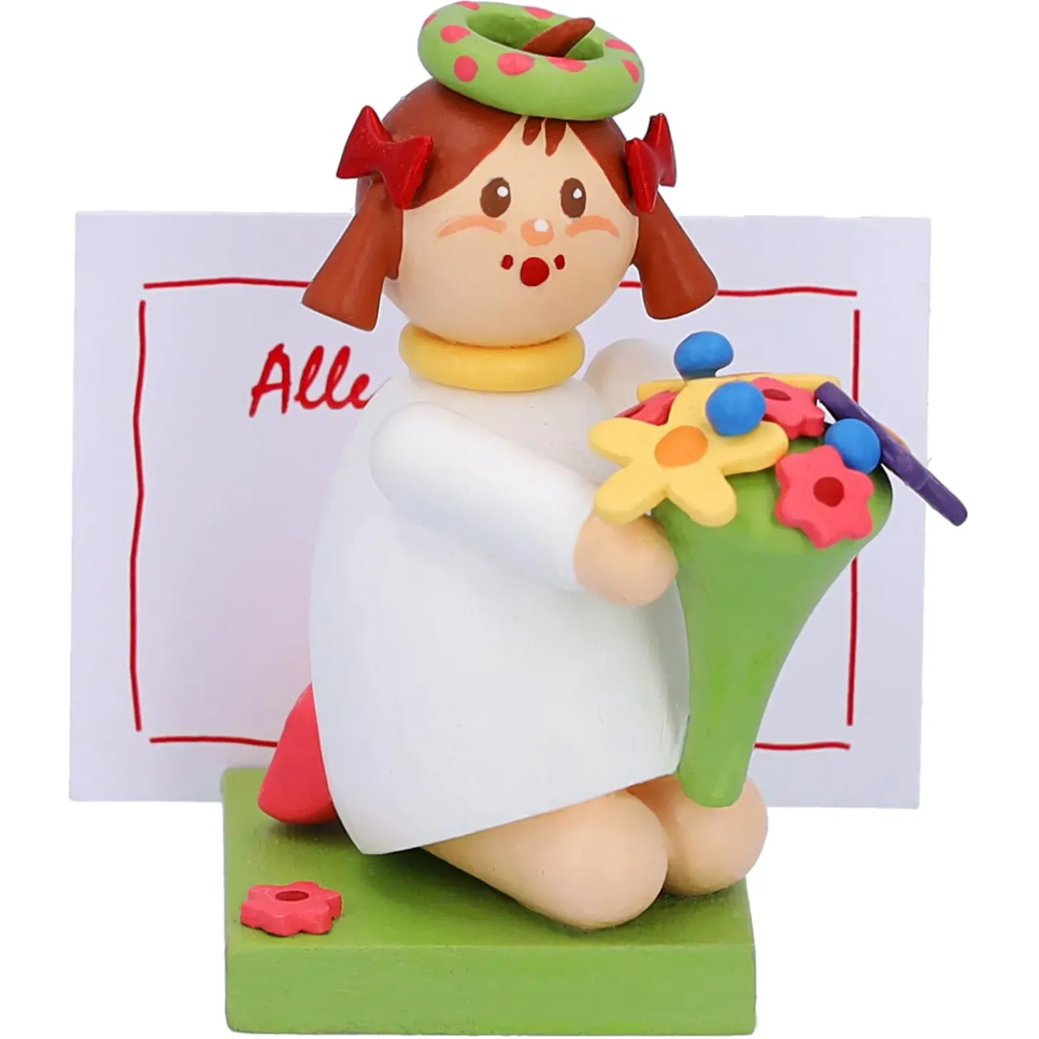 Das Putzige Madchen Im Weisen Kleid Und Mit Dem Blumenkranz Halt Einen Schonen Bunten Blumenstraus In Handen. Auf Dem Sockel Konnen Sie Ihre Personliche Botschaft Platzieren. Die Passenden Zettel Bringt Das Blumenmadchen Gleich Mit.