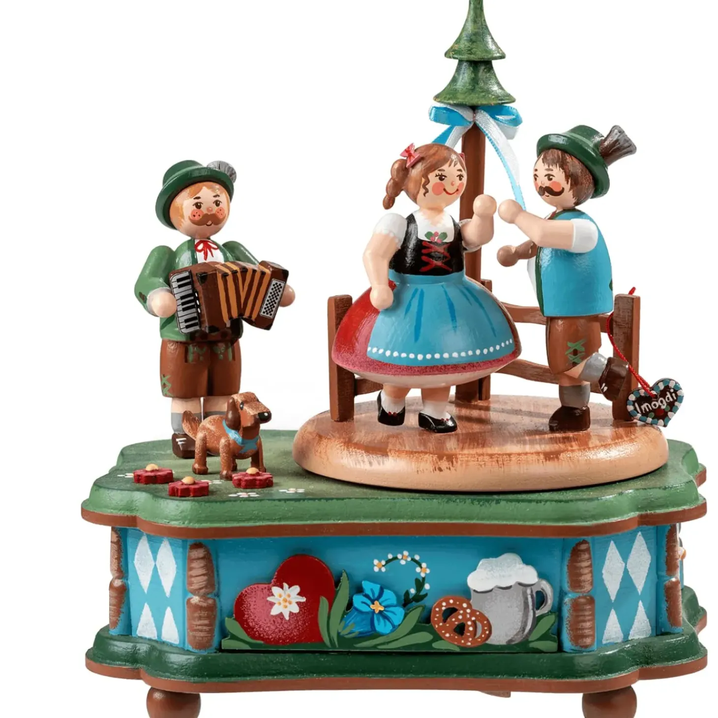 In Bayern Wird Tradition Und Brauchtum Noch Grosgeschrieben. Das Spiegelt Sich Auch In Der Traditionellen Kleidung Wider, Die Zu Besonderen Anlassen Und Festen Getragen Wird. Das Hubsche Trachtenpaar Tragt Hier Naturlich Dirndl Und Lederhosen Und Tanzt Freudig Auf Der Drehenden Buhne. Musikalisch Begleitet Werden Die Bayerischen Tanzer Von Einem Akkordeonspieler Und Ein Niedlicher Hund Beobachtet Den Heiteren Trubel! Die Einzigartige Musikdose Ein Schones Erinnerungsstuck An Eine Reise Nach Bayern, Aber Naturlich Auch Eine Freudvolle Dekoration Im Zuhause Echter Bayern-Fans!