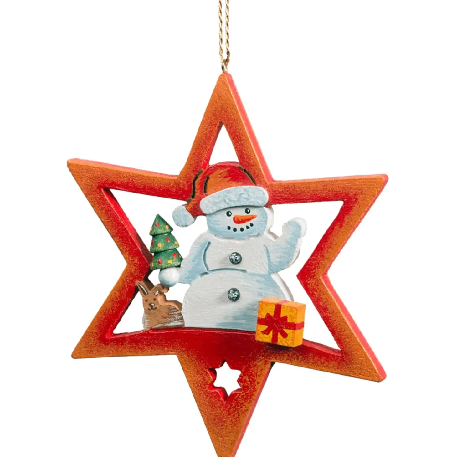 Dieses Bezaubernde Ornament Nimmt Sie Mit Auf Die Reise Ins Winterland Und Ist Ein Heiterer Hingucker In Ihrem Winterlich Dekorierten Heim! Der Knuffige Schneemann Kommt In Dem Roten Stern Besonders Schon Zur Geltung. Der Freundlich Winkende Wintergeselle Tragt Eine Rote Weihnachtsmutze Und Halt Ein Tannenbaumchen In Seiner Hand. Begleitet Wird Er Von Einem Niedlichen Braunen Haschen Und Zu Seinen Fusen Liegt Ein Geschenk. Was Da Wohl Drinnen Ist?
